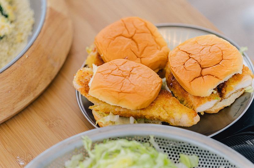 Nothing says comfort camping like the first bite of a crispy fried chicken sandwich. There's no need to be intimidated by pan frying in the great outdoors – with the proper gear and an assembly line of camp companions, you'll be savoring your sandwich in no time. You can easily adapt this recipe and enjoy the cutlets with rice and thinly sliced Nappa cabbage or even boxed Japanese curry!