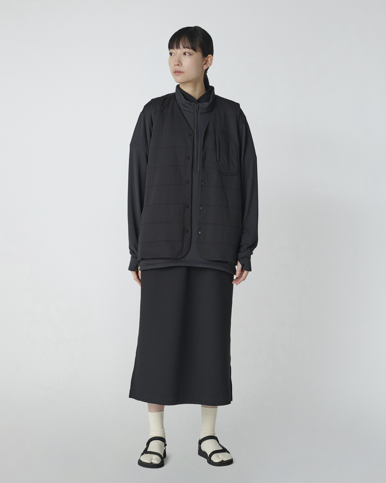 With a sleek, seam-free front placket, the vest offers a clean, modern look while maintaining its functionality. The crew neck design with snap-button closure allows easy layering, whether worn over a T-shirt or tucked beneath a jacket. A snap-button chest pocket provides secure storage for valuables, while seam-integrated side pockets offer effortless accessibility. Designed for a close fit, the vest contours to the body while allowing unrestricted movement. We recommend taking your normal size for a standard fit. For a buildable, layered look, pair it with the Recycled Cotton Hoodie underneath.